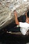 Ciągowy boulder w dachu zlokalizowany w Diabelskim Schronisku w Kusiętach.