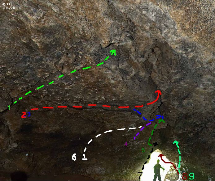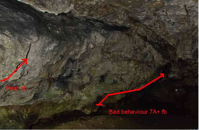 4 De profundis clamavi 7B+ - start z poprzecznego przęsła wewnątrz tunelu jakieś 4 metry głębiej i dojście bokiem filara w dachu do półki startowej Move shake drop